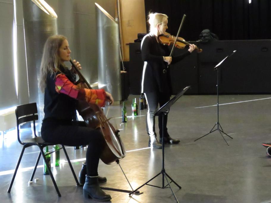 Instrumenter: Fiolin, cello, tromme og tomflasker!