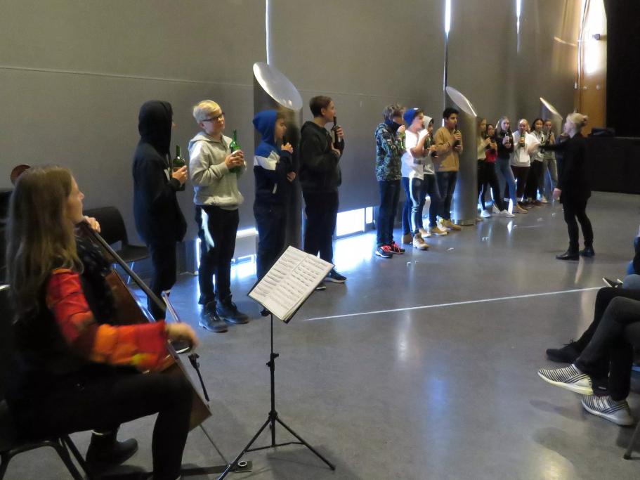 Forberedelser: Midtveis i konserten utfordres 16 av elevene til å blåse et barokkostinat på tomme vinflasker. Her er det en stor fordel om elevene har fått sjansen til å ”øve seg” på blåseteknikken på forhånd.